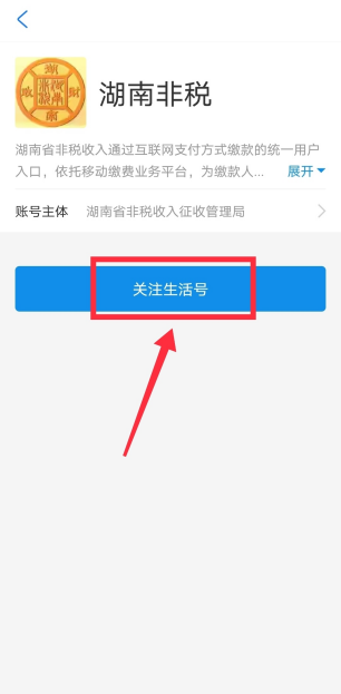 ① 认准“湖南非税”生活号,关注后点击屏幕下方“湖南非税”