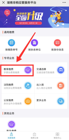 ① 认准“湖南非税”公众号,关注后点击“在线缴费”