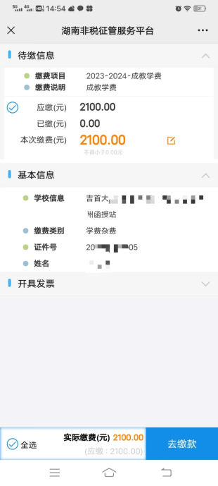 ④务必仔细核对基本信息缴费金额,确认无误后点击“去缴款