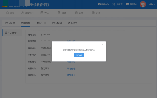 点击【我的账号】,查看实名认证,点击“认证提示”,根据提示进行人脸识别实名认证。