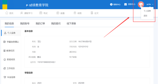 点击右上方的下拉框,进入【个人信息】界面。有【我的信息】、【我的账号】、【我的提问】导航栏。